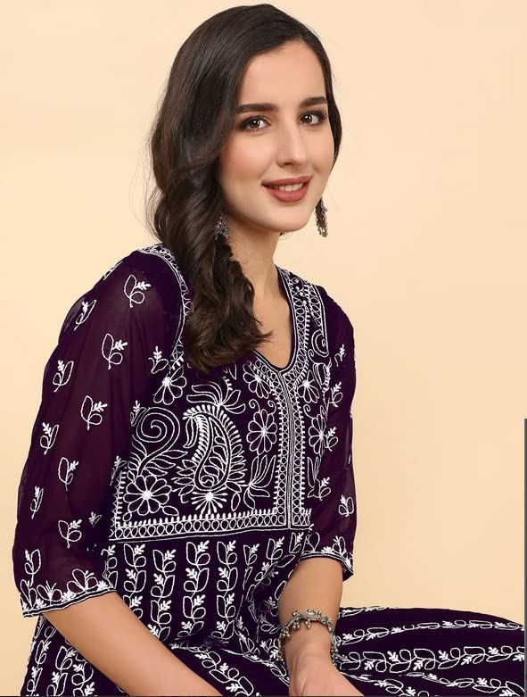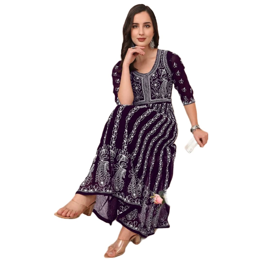 - Purple and White Floral Embroidered A-line shape with empire style Kurta
