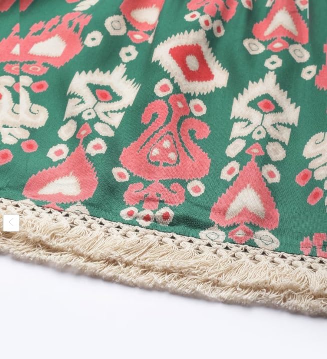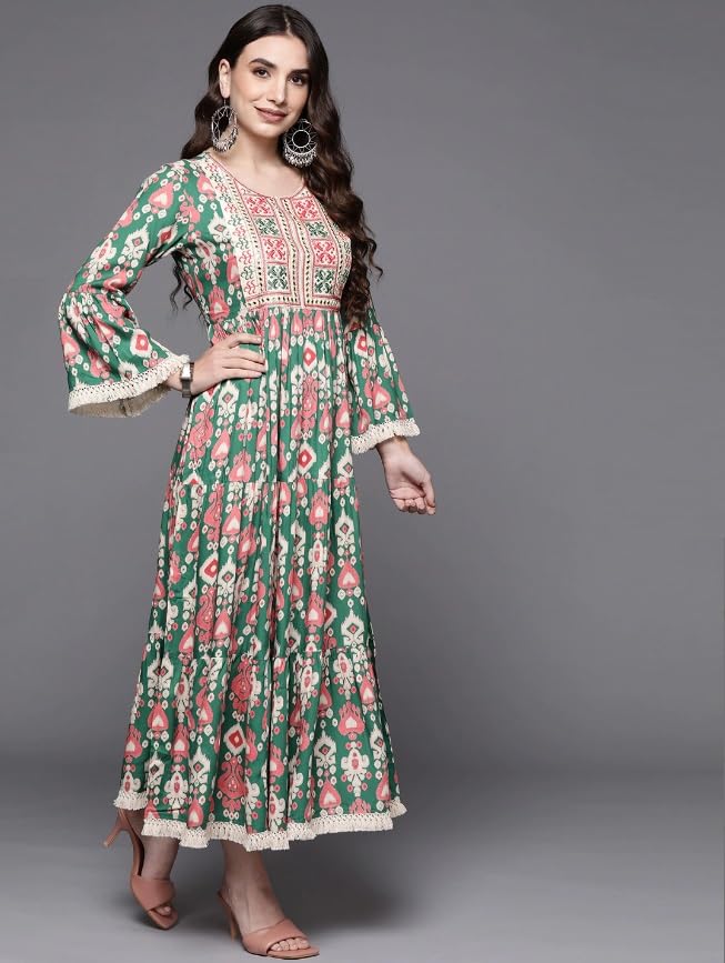 - Green and pink floral embroidered A-line Flared Ethnic Dress