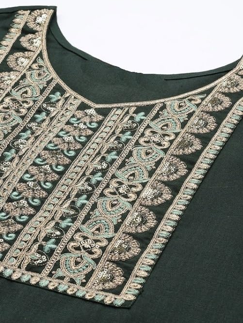 - Kurta has embroidered sequined design, straight shape, round neck, 3/4 sleeves, calf length with straight hem