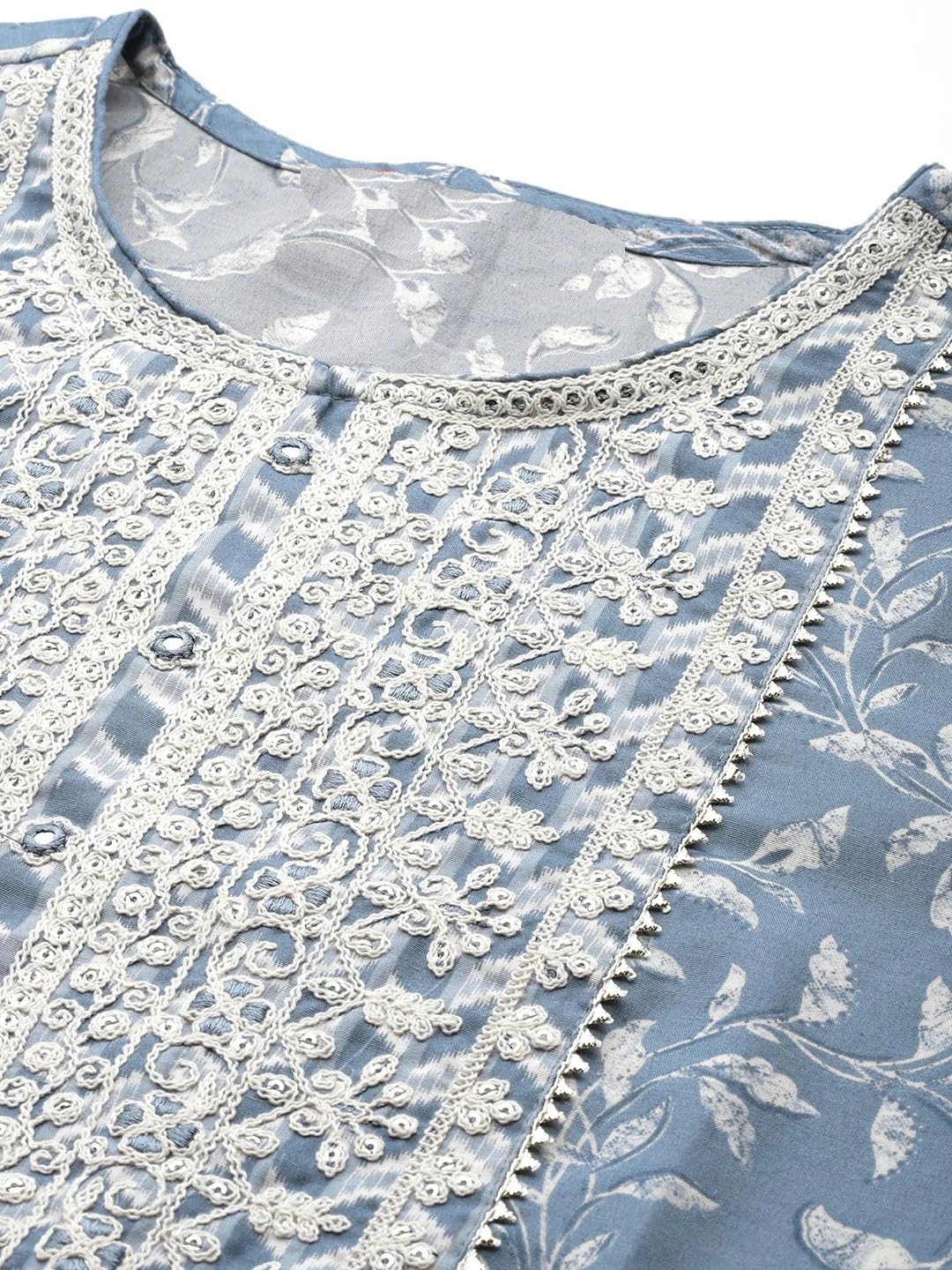 - Kurta has Floral Embroidered Yoke design, thread work detail, Straight shape, Round neck, 3/4 sleeves, Calf length with straight hem