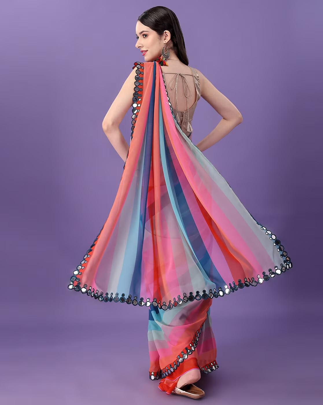 Ready to wear Saree Collection from India. Unstitched blouse to be tailored at your end. These unique light weight sarees are beautiful fancy stylish party wear dresses. Look gorgeous, fashionable and elegant. Blouse you can stich it to the best fit size. Extra laces, hangings & accessories are not included