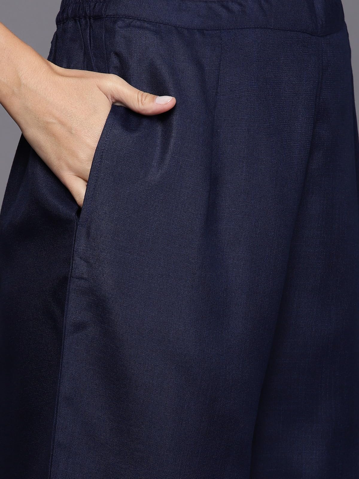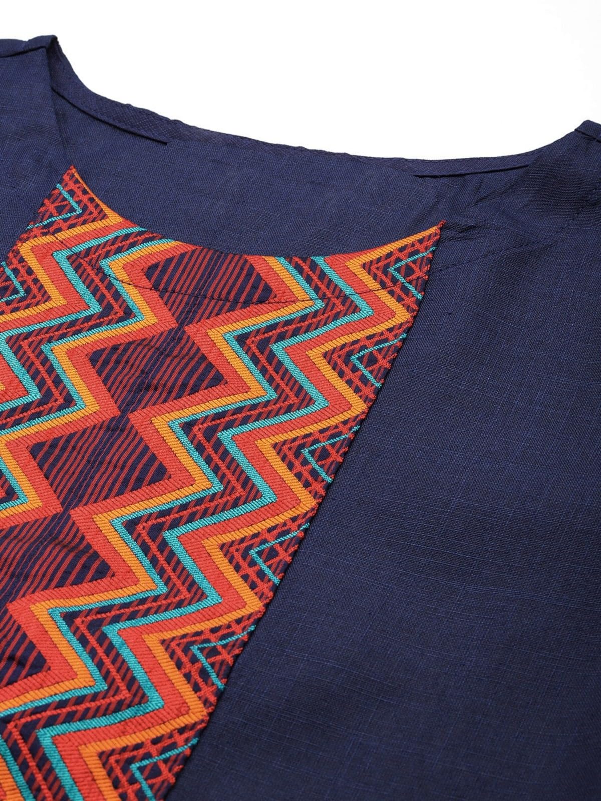 - Yoke Design Navy Blue Kurta with round neck, straight shape, 3/4 sleeves, calf length with straight hem