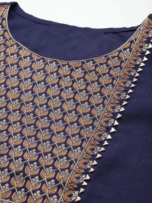 - Kurta has Yoke design, Zari detail, Straight shape, Round neck, 3/4 sleeves, Calf length length with straight hem