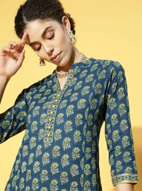 - Yoke Design Navy Blue Kurta with round neck, straight shape, 3/4 sleeves, calf length with straight hem