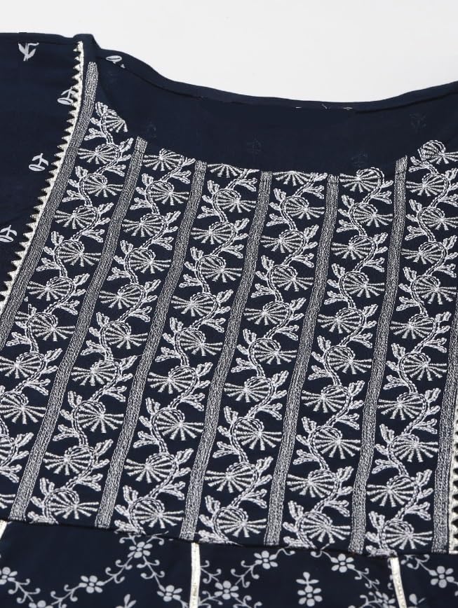 - Floral embroidered Anarkali shape Kurta has round neck, 3/4 sleeves, calf length with flared hem