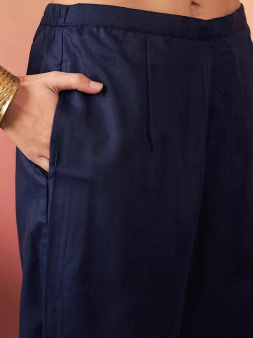 - Kurta design: Yoke Design Navy Blue Kurta with round neck, straight shape, 3/4 sleeves, calf length with straight hem