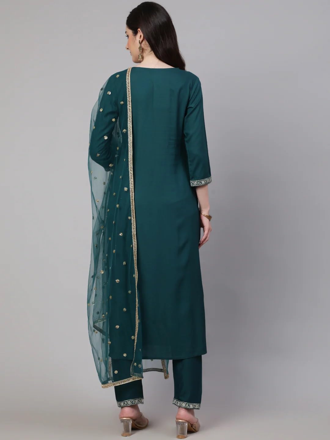 - Kurta & Bottom fabric: Viscose Rayon. Dupatta fabric: Net. Dry clean