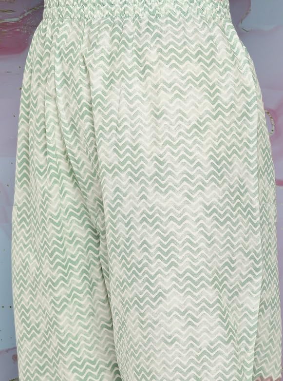- Printed palazzos, has a partially elasticated waistband with slip-on closure. Net dupatta