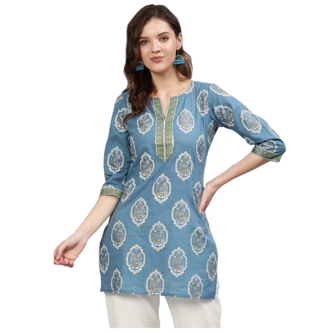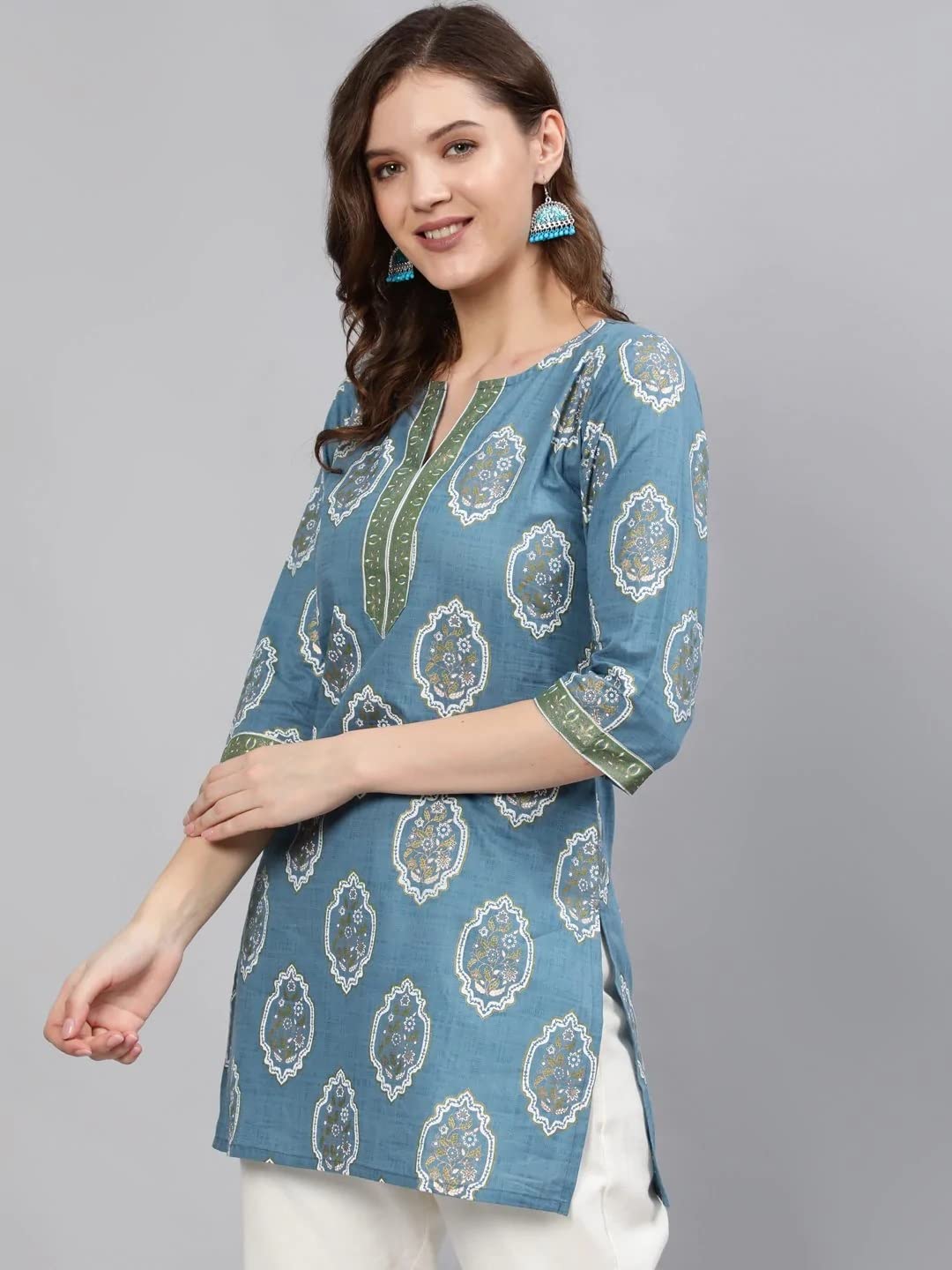 - Blue and white printed tunic, has a round neck, three-quarter sleeves