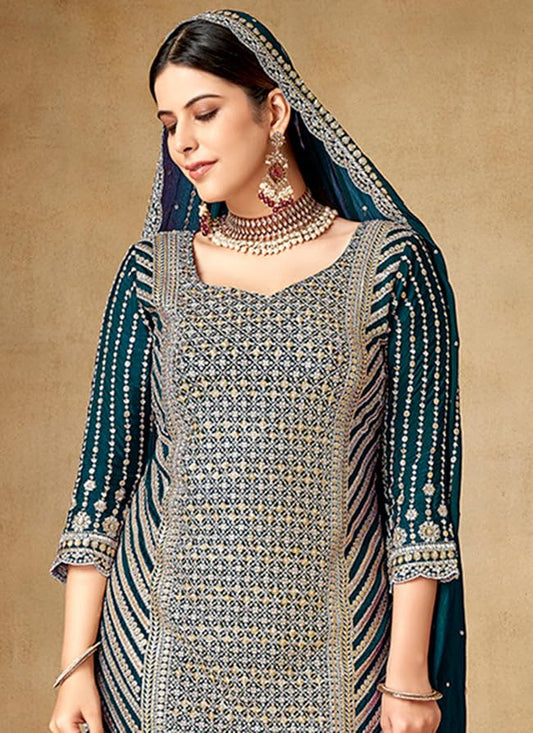 Unstitched Heavy Embroidered Chinnon Salwar Kameez | Designer Kurta Trouser Set with Dupatta | Traditional Festival Dress Material